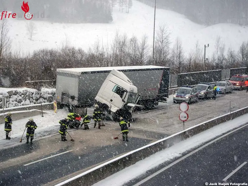 KLAUS (OÖ): Ein Lkw krachte am 5. Jänner 2017 auf der A 9 (Pyhrnautobahn, Gemeinde Micheldorf) gegen die Betonmittelleitwand. Dies führte zu einer Sperre der Autobahn für rund drei Stunden.