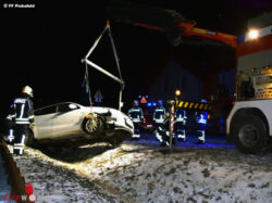 Verletzt wurde bei dem Crash glücklicherweise niemand. Die Feuerwehr Pinkafeld sicherte die Unfallstelle ab, stellte den Brandschutz sicher und führte mittels Kran (SRF) die Fahrzeugbergung durch. Nach ca. einer Stunde konnte wieder eingerückt werden.
