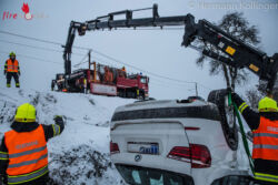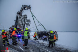 Die beiden unverletzt geblieben Insassen waren zuvor auf der salzmatschigen Fahrbahn ins Rutschen geraten, von der Straße abgekommen und dann über die steile Böschung geschlittert. Dort überschlug sich der Pkw schließlich und blieb auf dem Dach liegen.