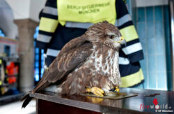 Bei seinen Befreiungsversuchen wurden Passanten auf ihn aufmerksam und riefen die Feuerwehr. Die alarmierten Einsatzkräfte des Kleinalarmfahrzeuges der Hauptfeuerwache nahmen den völlig erschöpften Jungvogel auf. Er war mittlerweile unsanft auf dem Boden gelandet. Da der Vogel nicht mehr fliegen konnte wurde er in die Vogelklinik Oberschleißheim gebracht.