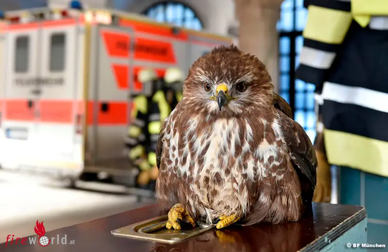 Bei seinen Befreiungsversuchen wurden Passanten auf ihn aufmerksam und riefen die Feuerwehr. Die alarmierten Einsatzkräfte des Kleinalarmfahrzeuges der Hauptfeuerwache nahmen den völlig erschöpften Jungvogel auf. Er war mittlerweile unsanft auf dem Boden gelandet. Da der Vogel nicht mehr fliegen konnte wurde er in die Vogelklinik Oberschleißheim gebracht.