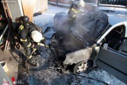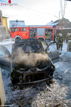 LINZ (OÖ): Aus bislang unbekannter Ursache ging am Dienstag Nachmittag, 10. Jänner 2017, in Pichling (Stadt Linz) ein Auto in Flammen auf. Durch die Hitzeentwicklung geriet bereits die Wärmedämmung eines angrenzenden Einfamilienhauses in Brand.