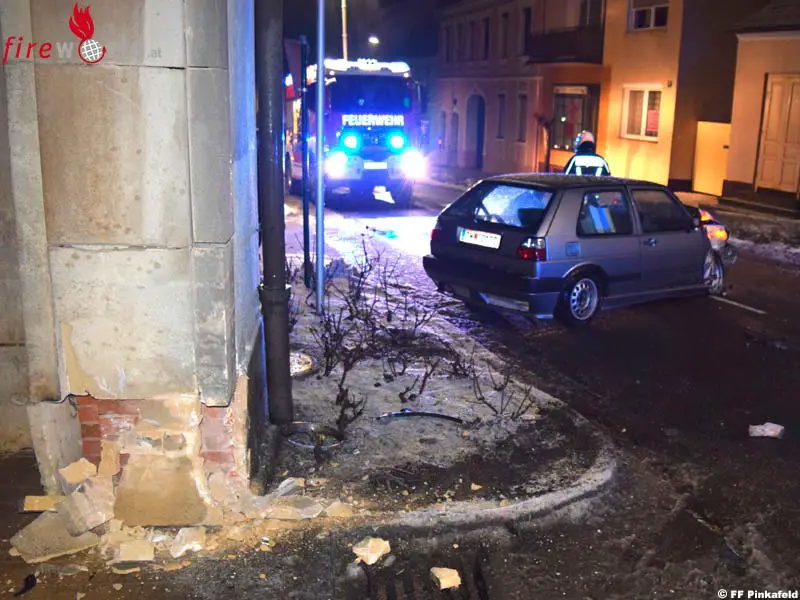 Die FF Pinkafeld rückte mit einem ELF (Einsatzleitfahrzeug), einem SRF (schweres Rüstfahrzeug), einem WLF (Wechselladerfahrzeug) und zehn Mann zum Einsatz aus. Aus ungeklärter Ursache waren ein Pkw ins Schleudern geraten, kam von der Fahrbahn ab, krachte seitlich in eine Säule des Rathauses und wurde wieder auf die Fahrbahn zurückgeschleudert.