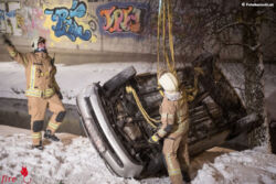 Die beiden Autoinsassen hatten Glück im Unglück: Der Pkw war von der Straße abgekommen und seitlich die Böschung hinunter gerutscht. Bevor das Fahrzeug in den Bach rutschen konnte wurde es von einem Baum aufgehalten. Vorbeikommende Ersthelfer halfen dem Lenker und seinem Enkel, die beide unverletzt geblieben waren aus dem verunfallten Fahrzeug. Das Auto wurde von der Berufsfeuerwehr Linz mit dem Schweren Rüstfahrzeug geborgen.
