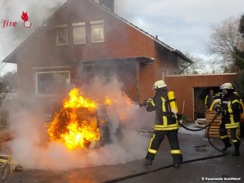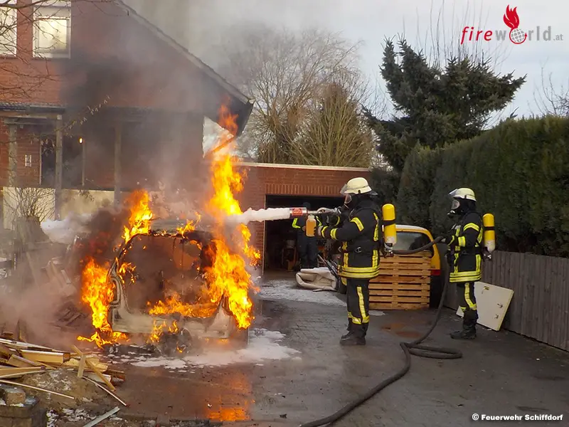 SCHIFFDORF (DEUTSCHLAND): Die Feuerwehr Schiffdorf ist am Sonntag, den 15.01.2017, um 09:29 Uhr zu einem Fahrzeugbrand in der Straße Große Litt in Schiffdorf-Friedheim alarmiert worden. Auf Grund glatter Straßen galt bei der Anfahrt äußerste Vorsicht.