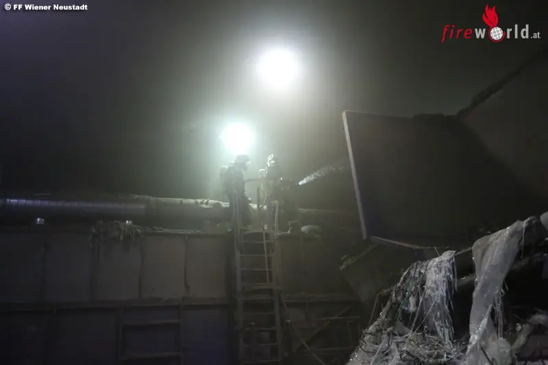 Kommandant und Einsatzleiter Josef Bugnar ließ die Alarmstufe zunächst auf B3, kurze Zeit später auf B4, die höchste Alarmstufe, erhöhen. Die Sirenen in Wiener Neustadt alarmierten weitere Einsatzkräfte. Weitere Atemschutztrupps wurden eingesetzt. So sicherte ein Trupp mit einem Rohr den hinteren Bereich des Maschinenblocks. Ein weiterer Trupp kontrollierte das Dach. Der erste Atemschutztrupp wurde, weil durchnässt bis auf die Unterhose und aufgrund der niedrigen Temperaturen, abgezogen und ins Feuerwehrhaus beordert. Da der Brand immer wieder aufflackerte wurde ein massiver Schaumangriff befohlen. So wurde die Maschine mit Löschschaum überzogen.
