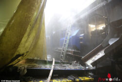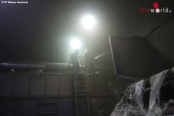 Die ausgelöste Sprinkleranlage hielt zwar die Flammen außerhalb der Maschine von einem Übergreifen auf den dortigen Müll ab. Allerdings konnte das Wasser der Sprinkleranlage nicht in die Maschine eindringen, von wo aus der Brand ausging. Der erste Atemschutztrupp löschte mit den beiden Rohren die Flammen im Inneren des Zerkleinerers ab. Dazu musste der Trupp direkt zur Maschine vordringen. Mit einer Leiter kletterten die Feuerwehrmänner mit den Atemschutzgeräten auf das Förderband und löschten in die Öffnung wo der Müll im Zerkleinerer brannte.