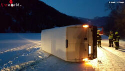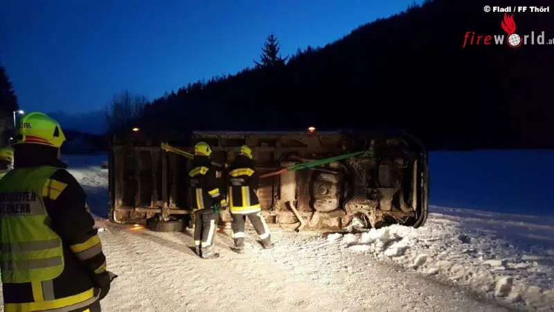 Stmk: Kastenwagen auf Schneefahrbahn in Thörl verunfallt und umgestürzt