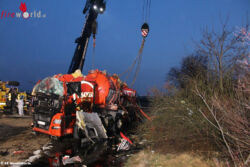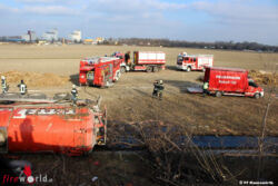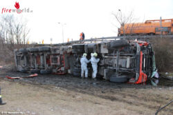 Ein Tankwagenzug durchstieß die Leitschiene und stürzte über die Böschung in den Straßengraben und kam seitlich zum Liegen. Bei der Erkundung des Einsatzleiters wurde festgestellt, dass es sich um einen Gefahrenguttransporter handelt und dieser Leck geschlagen hat. Bei dem transportierten Gefahrgut handelte es sich um schwer entflammbaren Ölschlamm.