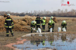 Der umgehende Nahbereich war bereits mit Ölschlamm kontaminiert. Parallel zur Menschenrettung wurde ein mehrfacher Brandschutz aufgebaut. Aufgrund der großen Menge an ausgetretenem Ölschlamm entschied sich der Einsatzleiter, den Schadstoffzug der Feuerwehr Schwechat hinzuzuziehen. Der ca. 200m² große Ölsee wurde von den Kameraden eingedämmt, um eine weitere Ausbreitung zu vermeiden.