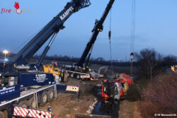 Um die Bergung zu beschleunigen, führte man bis zum Eintreffen der Bergefirma erste Maßnahmen wie das Entfernen der Kardanwelle durch. Dabei haben sich die Kameraden mit Schutzanzügen der Schutzstufe 2 ausgerüstet um den Kontakt mit dem Ölschlamm zu vermeiden. Der Sattelzug wurde durch zwei Kräne der Fa. Kampel aufgestellt. Während der gesamten Bergeaktion führte eine bereits von der BH beauftragte Firma das Abtragen des kontaminierten Erdreiches durch.