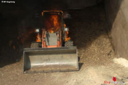 AUGSBURG (BAYERN): Um 12.03 Uhr des 21. Jänner 2017 wurde die Berufsfeuerwehr Augsburg zum Brand eines Radladers in den Dr. Ziegenspeckweg gerufen. Beim Eintreffen der ersten Einsatzkräfte stand ein Radlader in einer offenen Lagerhalle für Hackschnitzel in Vollbrand.