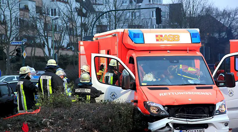 ESSEN (DEUTSCHLAND): Bei einem Verkehrsunfall zwischen einem Pkw und einem Rettungswagen (RTW) des Arbeiter-Samariter-Bundes (ASB) Essen sind am Nachmittag des 23.01.2017 gegen 16.00 Uhr vier Menschen schwer verletzt worden.