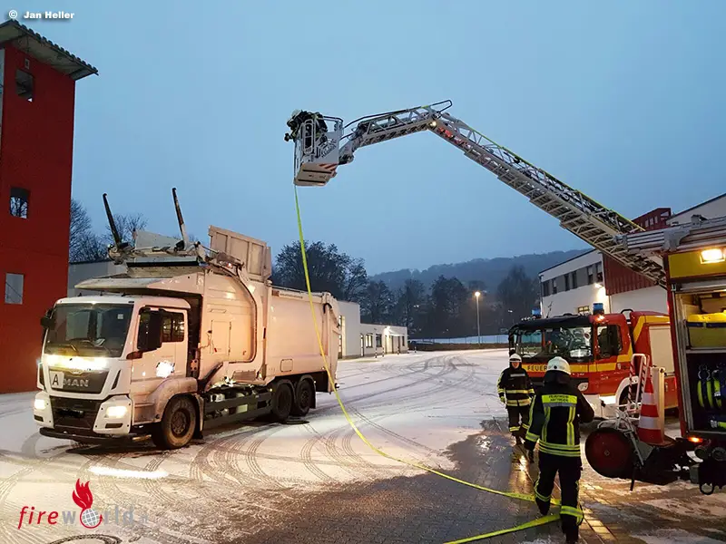 Der Fahrer eines Entsorgungsfahrzeugs bemerkte im Ladebereich Rauch. Da er sich in der Nähe der Hattinger Hauptwache befand, steuerte er diese an. Zuvor setzte er jedoch richtigerweise den Notruf ab. So erwarteten ihn die Einsatzkräfte bereits an der Wache. Über die Drehleiter kontrollierten die Rettungskräfte die Ladung durch die Ladeöffnung auf dem Fahrzeug mit einer Wärmebildkamera. Hier konnte jedoch keine erhöhte Temperatur gemessen werden. Auch die weiteren Kontrollen blieben ohne Ergebnis. Daher konnte der Fahrer seine Fahrt anschließend wieder fortsetzen.