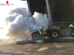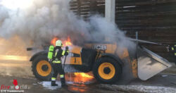 FRANKENMARKT (OÖ): Am 26.01.2017 um 13:57 Uhr wurde die Feuerwehr Frankenmarkt gemeinsam mit der Feuerwehr Raspoldsedt zum Brand eines Radladers bei der Nahwärme Frankenmarkt alarmiert. Der Lenker konnte den Lader glücklicherweise noch ins Freie bringen, bevor dieser in Flammen aufging.