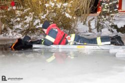 Ein gut ausgerüsteter Kamerad der Feuerwehrtaucher stellte sich als Verunglückter zur Verfügung, der in einem Teich in Seewalchen eingebrochen war. Es wurden verschiedene Methoden eingesetzt, um ihn so rasch wie möglich aus dem eiskalten Wasser zu retten. Die tiefwinterlichen Bedingungen taten ihr übriges dazu, um diese Übung anspruchsvoll und herausfordernd zu machen.