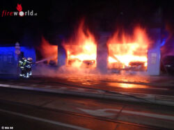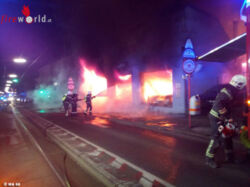Die Einsatzkräfte bekämpften die Flammen über einen längeren Zeitraum mit mehreren Löschleitungen und Wasserwerfern, die auf den Dächern der Einsatzfahrzeuge montiert sind. Im Obergeschoß waren geringe Mengen an Spray- und Lackdosen gelagert, die während der Löscharbeiten explodierten.