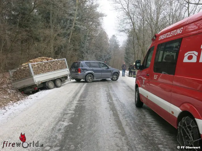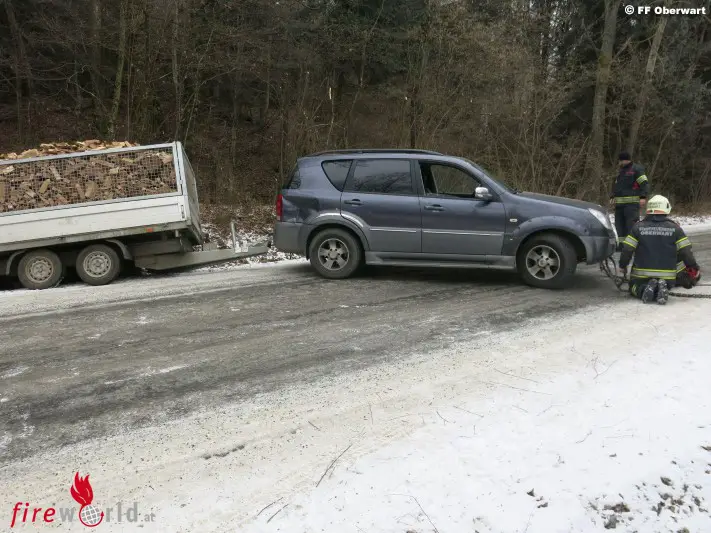 OBERWART (BGLD): Am Dienstag, dem 31.01.2017, wurde die Feuerwehr Oberwart um 11:42 Uhr zu einer Fahrzeugbergung auf dem Güterweg richtung Buchschachen alamiert. Am Einsatzort angekommen stellte sich heraus, dass ein Pkw mit einem vollgeladenen Anhänger in den Graben gerutscht war.