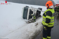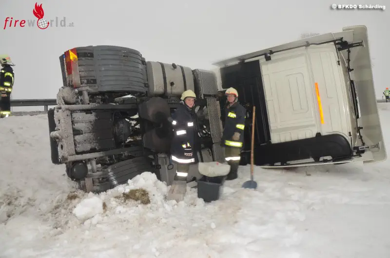Die Sattelzugmaschine war aus noch ungeklärter Ursache ohne Beteiligung eines weiteren Fahrzeugs von der Straße abgekommen, über eine ca. zwei Meter hohe Böschung gestürzt und kam seitlich zum Liegen. Unter Einsatz einer Leiter wurde der Fahrer aus der misslichen Lage befreit und dem Notarzt übergeben. Die Feuerwehr sicherte die Unfallstelle ab. Weiters wurden auslaufende Betriebsmittel aufgefangen. In weiterer Folge wird die Bergung – welche von einem Privatunternehmen durchgeführt wird – unterstützt. Die Feuerwehr Wernstein konnte nach rund einer Stunde wieder einrücken, die FF Schardenberg bleibt noch bis zum Ende der Bergungsarbeiten Einsatzort.
