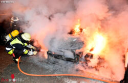 MÜNCHEN (BAYERN): Gegen Mitternacht hat die Integrierte Leitstelle am 31. Jänner 2017 ein Löschfahrzeug der Hauptfeuerwache München zu einem brennenden Auto alarmiert. Als die Einsatzkräfte eintrafen, war die gesamte Front des Hyundai bereits in Brand geraten.