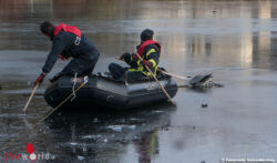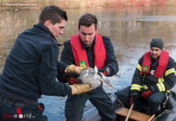 Ohne Hilfsmittel konnte dem Vogel aber nicht geholfen werden, also rückten von der Feuerwache Altstadt ein Löschfahrzeug und eine Drehleiter zur Unterstützung aus. Mit einem Schlauchboot begannen zwei Einsatzkräfte sich zu dem Vogel vorzuarbeiten und nach wenigen Minuten hatten sie das Tier erreicht. Wie sich dann herausstellte, war der Reiher nicht im Eis festgefroren, sondern lediglich völlig entkräftet und nicht mehr in der Lage, selbstständig wegzufliegen. Behutsam wurde das Tier aus dem Wasser gehoben und mit dem Boot ans Ufer gebracht. Anschließend ging es zur weiteren Untersuchung in eine Tierklinik.