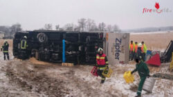 Aufgabe der Feuerwehr war es, die Fahrzeugbergung durchzuführen. Zuerst wurde die Ladung des Lkw auf ein anderes Transportfahrzeug umgeladen. Anschließend wurde das verunfallte Fahrzeug mit zwei Seilwinden wieder auf die Räder gestellt. Glück im Unglück: Verletzt wurde niemand.