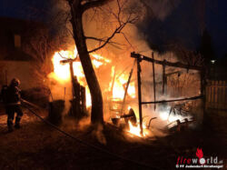 Die Feuerwehr stellte beim Eintreffen der ersten Löschmannschaften am Einsatzort einen in Vollbrand stehenden Geräteschuppen fest und trug unverzüglich einen Löschangriff mit einer Löschleitung unter schwerem Atemschutz vor. Die Teleskopmastbühne der BtF SAPPI wurde aufgrund der vorgefundenen Lage abbestellt, stattdessen ein weiteres Tanklöschfahrzeug nachbeordert.