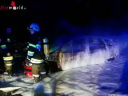 Zu diesem Zeitpunkt stand das Fahrzeug bereits in Vollbrand. Die Löscharbeiten wurden mittels Schaum erledigt und es konnte ein Übergreifen des Feuers auf einen Holzstapel und auf Strauchwerk verhindert werden.