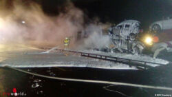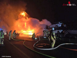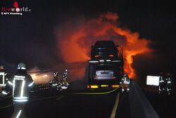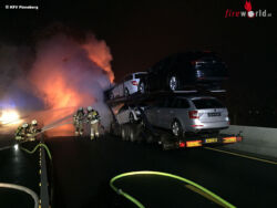 Lkw brennt, vier Neuwagen schon erfasst