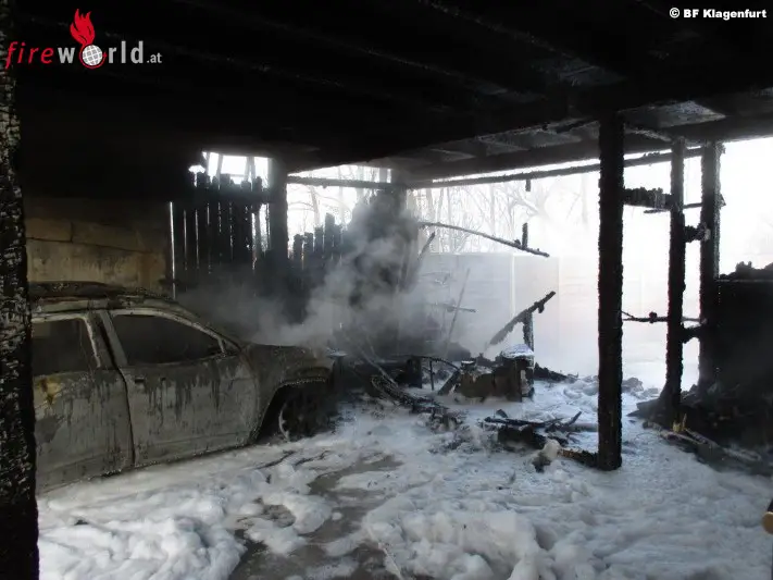 KLAGENFURT (KTN): In Klagenfurt ist am Morgen des 3. Februar 2017 ein Carport samt den darin abgestellten Pkw in Flammen aufgegangen. Auch die Fassade eines Wohnhauses wurde schwer in Mitleidenschaft gezogen, berichtet die Berufsfeuerwehr Klagenfurt.