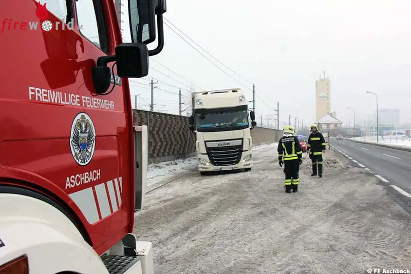 ASCHBACH (NÖ): Am 2. Februar 2017 wurde die Feuerwehr Aschbach erneut zu einer Lkw-Bergung auf den Abstellplatz beim Bahnhof neben der B122 alarmiert.