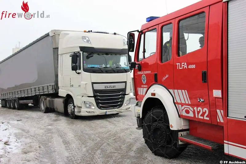 ASCHBACH (NÖ): Am 2. Februar 2017 wurde die Feuerwehr Aschbach erneut zu einer Lkw-Bergung auf den Abstellplatz beim Bahnhof neben der B122 alarmiert.