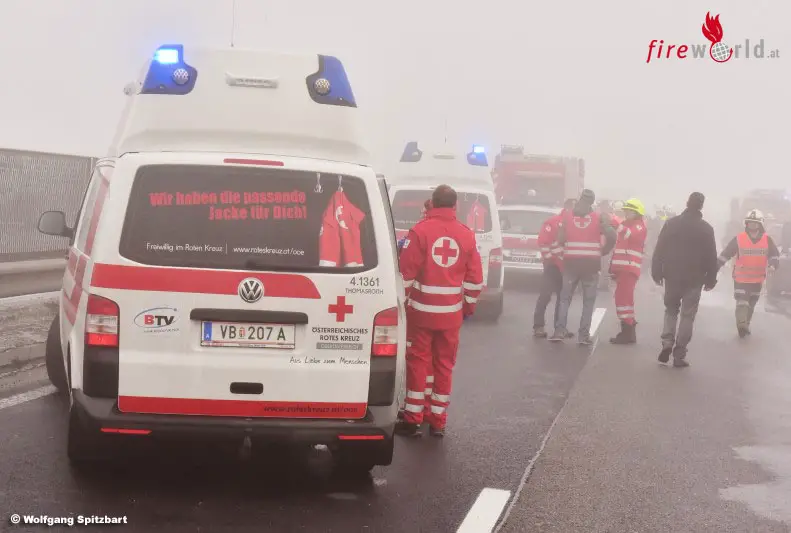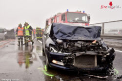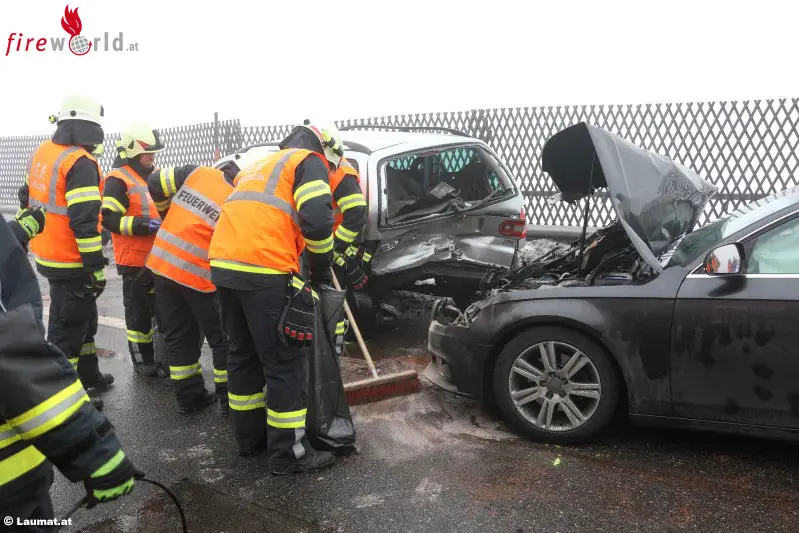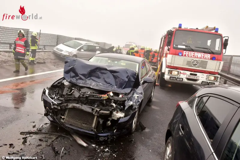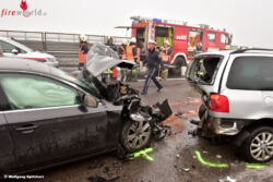 REGAU (OÖ): Ein Serienunfall mit acht beteiligten Autos und zehn Verletzten ereignete sich Samstagmittag, 4. Februar 2017, auf der Aurachtalbrücke auf der Westautobahn zwischen Regau und Laakirchen West.