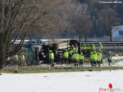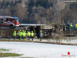 ANGER (BAYERN): Am Sonntagmorgen, 5. Februar 2017, ist ein Milchtransporter von Autobahn A8 auf Höhe der Ortschaft Aufham nach rechts von der Fahrbahn abgekommen und umgestürzt. Da anfangs nicht genau klar war, wie schwer der Unfall ist, alarmierte die Leitstelle Traunstein zusammen mit einem Rettungswagen aus Teisendorf auch die Freiwillige Feuerwehr Anger.