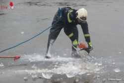 Binnen kürzester Zeit konnte die Feuerwehr Brunn mit der Großpumpe und Begleitfahrzeug nach Wolfsthal ausrücken. Es galt die Wohnsiedlung neben dem Teich zu schützen um weitere Schäden zu verhindern. Wegen der vorangegangen kalten Temperaturen der letzten Wochen war der Teich mit einer rund 40cm dicken Eisschicht überzogen. Um die drei Saugköpfe der SPA 900 richtig zu positionieren, musste die Eisdecke mittels Motorkettensäge geöffnet werden. Die Feuerwehr Brunn steht bis auf Weiteres mit der Großpumpe und 2 Mann im Einsatz.