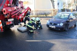 Ein Pkw war derartig deformiert, dass die Hilfe der Feuerwehr benötigt wurde. Der VW wurde mit dem Abschleppgalgen des schweren Rüstfahrzeuges angehoben und anschließend auf einem Parkplatz gesichert abgestellt. Abschließend wurde der Kreuzungsbereich, von umherliegenden Fahrzeugteilen, gesäubert sowie ausgelaufene Betriebsmittel beseitigt.