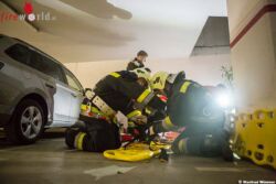 Bei der Erkundung stellte sich heraus, dass ein Mann durch einen Lüftungsschacht mehrere Meter abgestürzt war und im zweiten Untergeschoß einer Tiefgarage zum Liegen gekommen war. Der Zugang konnte über ein öffentliches Stiegehaus direkt erfolgen. Die Feuerwehrkräfte unterstützen die Rettungskräfte samt Notärztin bei der Versorgung des Verletzten an Ort und Stelle.