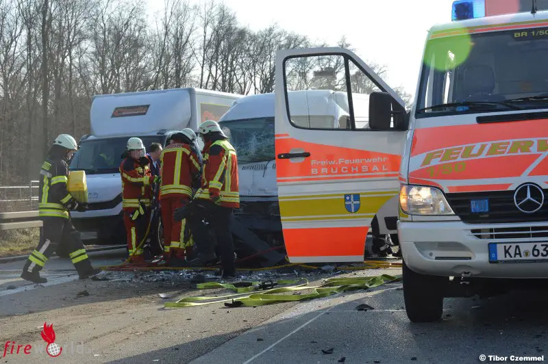 Am Montagnachmittag, 13. Februar 2017, wurde um 14.44 Uhr die Bruchsaler Feuerwehr und die Feuerwehr Forst zu einem Verkehrsunfall mit eingeklemmter Person auf die BAB 5 in Richtung Frankfurt gerufen. Etwa eineinhalb Kilometer vor der Abfahrt Kronau war ein Kleintransporter auf der rechten Fahrspur einem LKW Hänger Zug aufgefahren. Hierbei wurde der Fahrer des Transporters schwer verletzt und in seinem Fahrzeug eingeklemmt. Der LKW-Fahrer blieb unverletzt.