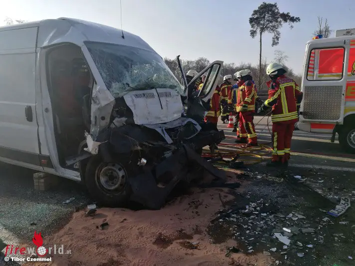 BRUCHSAL (DEUTSCHLAND): Aus noch ungeklärten Umständen fuhr ein Kleintransporter auf der BAB 5 in Richtung Frankfurt auf einen Lkw-Hänger-Zug. Der Fahrer des Kleintransporters wurde dabei schwer verletzt und eingeklemmt.