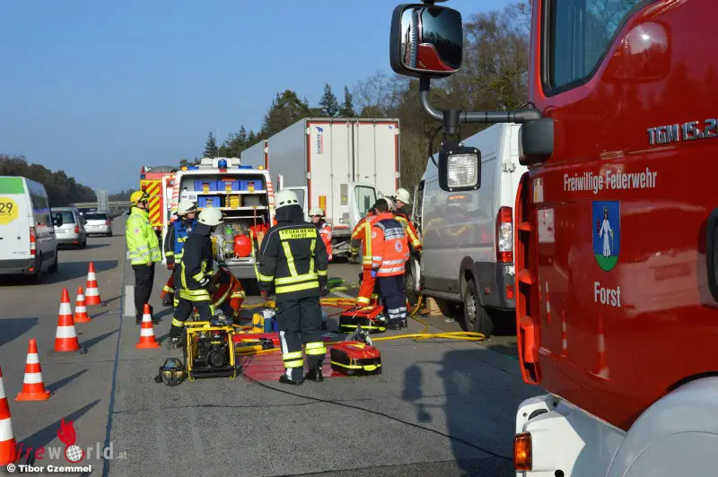 Am Montagnachmittag, 13. Februar 2017, wurde um 14.44 Uhr die Bruchsaler Feuerwehr und die Feuerwehr Forst zu einem Verkehrsunfall mit eingeklemmter Person auf die BAB 5 in Richtung Frankfurt gerufen. Etwa eineinhalb Kilometer vor der Abfahrt Kronau war ein Kleintransporter auf der rechten Fahrspur einem LKW Hänger Zug aufgefahren. Hierbei wurde der Fahrer des Transporters schwer verletzt und in seinem Fahrzeug eingeklemmt. Der LKW-Fahrer blieb unverletzt.