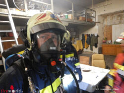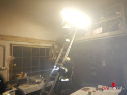 Zur weiteren Erkundung innerhalb des Gebäudes rüsteten sich schon auf der Anfahrt zwei Atemschutztrupps aus, betraten das Objekt und evakuierten die Personen aus den Wohnungen. Parallel dazu wurde ein Löschangriff mit einem C-Hohlstrahlrohr im Innenangriff vorbereitet und nach der Menschenrettung, die Brandstelle im Erdgeschoß auf einem Hochregallager erfolgreich abgelöscht. Zur Sicherung gegen einen möglichen Brandüberschlag auf das Nachbargebäude wurde ebenso ein C-Hohlstrahlrohr im Außenbereich eingesetzt. Mit zwei Hochleistungslüftern konnte parallel zu den weiteren Erkundungs- und Löschmaßnahmen das Gebäude schrittweise entraucht und belüftet werden.