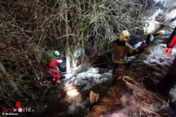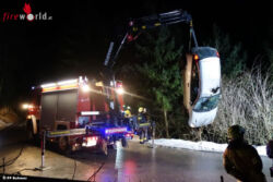Aus bisher unbekannter Ursache kam das Auto von der Fahrbahn ab, stürzte über die Böschung ca. 15 Meter in den sehr steilen Wald. Die vielen Bäume verhinderten einen weiteren Absturz.