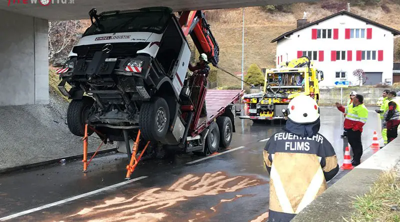 TAMINS (SCHWEIZ): In Tamins ist es am Dienstagvormittag, 21. Februar 2017, zu einem Verkehrsunfall mit einem Lastwagen gekommen. Der Lastwagen fuhr mit teilweise ausgefahrenem Kran durch eine Unterführung und blieb hängen. Der Chauffeur wurde mittelschwer verletzt.