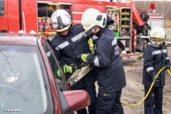 Nach einem schweren Verkehrsunfall im Bereich Johannisweg war Hilfe der Feuerwehr dringend erforderlich. Der Lenker, dargestellt von einem Mitglied der Jugendgruppe, wurde dabei in seinem Fahrzeug eingeschlossen. Jetzt muss jeder Handgriff sitzen: Einsatzstelle absichern, Brandschutz aufbauen, Fahrzeug sichern, Menschenrettung durchführen usw. Nachdem der Pkw geöffnet war, konnte die Person unter Beiziehung eines Spineboards gerettet und anschließend dem Rettungsdienst übergeben werden.