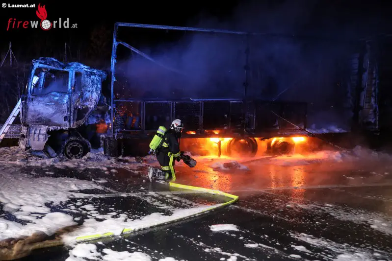 MEGGENHOFEN (OÖ): Fünf Feuerwehren standen am Dienstag, 21. Februar 2017, in den frühen Morgenstunden bei einem Lkw-Vollbrand auf der Innkreisautobahn bei Meggenhofen (Bezirk Grieskirchen) im Einsatz.
