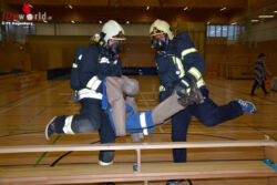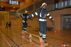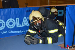 Kamerad Martin Remplbauer, staatlich geprüfter Fitnessinstruktor, ließ sich dafür einen äußerst herausfordernden Parcours einfallen. Balancieren, Kriechen, Hindernisse überwinden, Übungspuppe schleppen – alles in voller Einsatzuniform mit schweren Atemschutz. Um die Teilnehmer bis an ihre Leistungsgrenzen zu bringen, wurde schließlich noch die Atemschutzmaske verklebt. Im „Blindflug“ galt es so die Hindernisse zu bewältigen und sich im „Spinnennetz“ nicht zu verheddern.