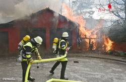 Die Einsatzkräfte konnten auf der Anfahrt die starke Rauchentwicklung bereits aus großer Entfernung sehen. Ein Anbau neben drei Garagen war in Vollbrand. Mehrere Trupps mit schwerem Atemschutz gingen mit drei C-Rohren und einem B-Rohr zur Brandbekämpfung vor. Da das Feuer bereits auf die Garagen übergriff, musste zum Ablöschen deren Dachhaut geöffnet werden.Nach etwa einer Stunde war das Feuer aus. Verletzte gab es keine. Der Sachschaden wird von der Feuerwehr auf zirka 20.000 Euro geschätzt.