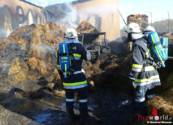 Der Großbrand auf einem Bauernhof im Gemeindegebiet von Dürnstein hielt die Einsatzkräfte der Freiwilligen Feuerwehr auch am Tag danach auf Trab. Mehr als 100 brennende Strohballen mussten mit einem Teleskoplader aus einem Stall gebracht werden. Zuvor waren 29 Feuerwehren aus den Bezirken Krems, Melk und St. Pölten im Einsatz, um den Brand zu löschen.