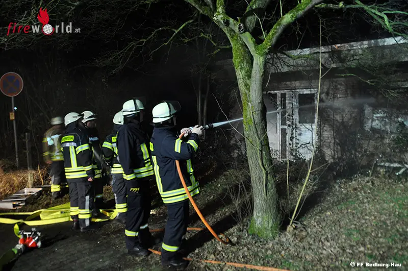 Um 01:04 Uhr wird die Freiwillige Feuerwehr Bedburg-Hau alarmiert. Die Anfahrt ist kurz. Die ersten Feuerwehrmänner die an ihren Fahrzeugen eintreffen, stehen selber im Brandrauch. Das brennende Gebäude ist ein Anbau ihres Gerätehauses an der Kalkarer Straße. Zunächst gilt es den Brand im ehemaligen Garten zu bekämpfen. Hier brannten ein Holzschrank und ein Bürostuhl. Der Gebäudebrand selber ist schnell unter Kontrolle. Die Feuerwehrmänner löschen von außen. Auch ist ein Angriffstrupp unter Atemschutz im Gebäude. Sie löschen mit einem C-Rohr das Feuer. Hier brannten ein Sessel, Holz- und Papierreste, aber auch ein Rasenmäher. Mit einem Hochleistungslüfter wird das Gebäude vom Brandrauch befreit.