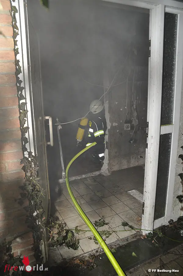 Um 01:04 Uhr wird die Freiwillige Feuerwehr Bedburg-Hau alarmiert. Die Anfahrt ist kurz. Die ersten Feuerwehrmänner die an ihren Fahrzeugen eintreffen, stehen selber im Brandrauch. Das brennende Gebäude ist ein Anbau ihres Gerätehauses an der Kalkarer Straße. Zunächst gilt es den Brand im ehemaligen Garten zu bekämpfen. Hier brannten ein Holzschrank und ein Bürostuhl. Der Gebäudebrand selber ist schnell unter Kontrolle. Die Feuerwehrmänner löschen von außen. Auch ist ein Angriffstrupp unter Atemschutz im Gebäude. Sie löschen mit einem C-Rohr das Feuer. Hier brannten ein Sessel, Holz- und Papierreste, aber auch ein Rasenmäher. Mit einem Hochleistungslüfter wird das Gebäude vom Brandrauch befreit.